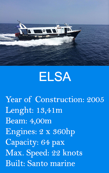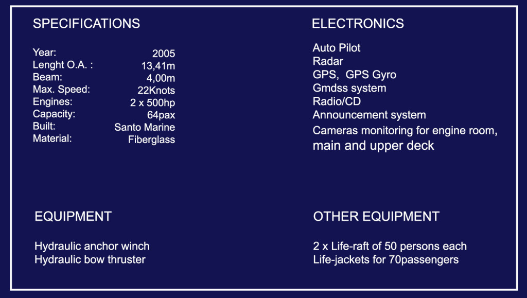 This is a really beloved boat from all the boatmen of the union, the name comes from the president’s sister name, Elsa. We bought this vessel on 2005 and immediately we extremely change the hull, the deck, the birdge. The boat has a whole lenght indoor lounge that accomodates 64 passengers in comofrtable cruising armchairs. We also installed new engines, 360 hp each one that permit to this aerodynamic and light boat to reach highspeeds over 23 knots.