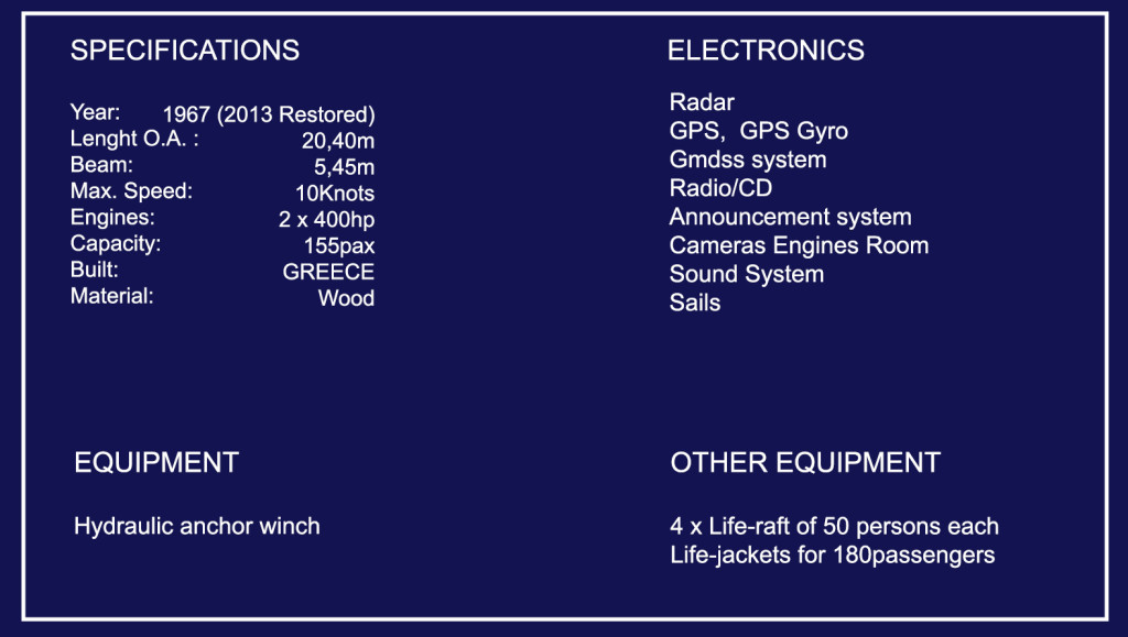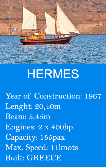 The boat has been named in honor of Hermes an Olympian god in Greek religion and mythology, son of Zeus and the Pleiad Maia. He is second youngest of the Olympian gods. Hermes is a god of transitions and boundaries. He is quick and cunning, and moves freely between the worlds of the mortal and divine, as emissary and messenger of the gods, intercessor between mortals and the divine, and conductor of souls into the afterlife. He is protector and patron of travelers, herdsmen, thieves, orators and wit, literature and poets, athletics and sports, invention and trade.