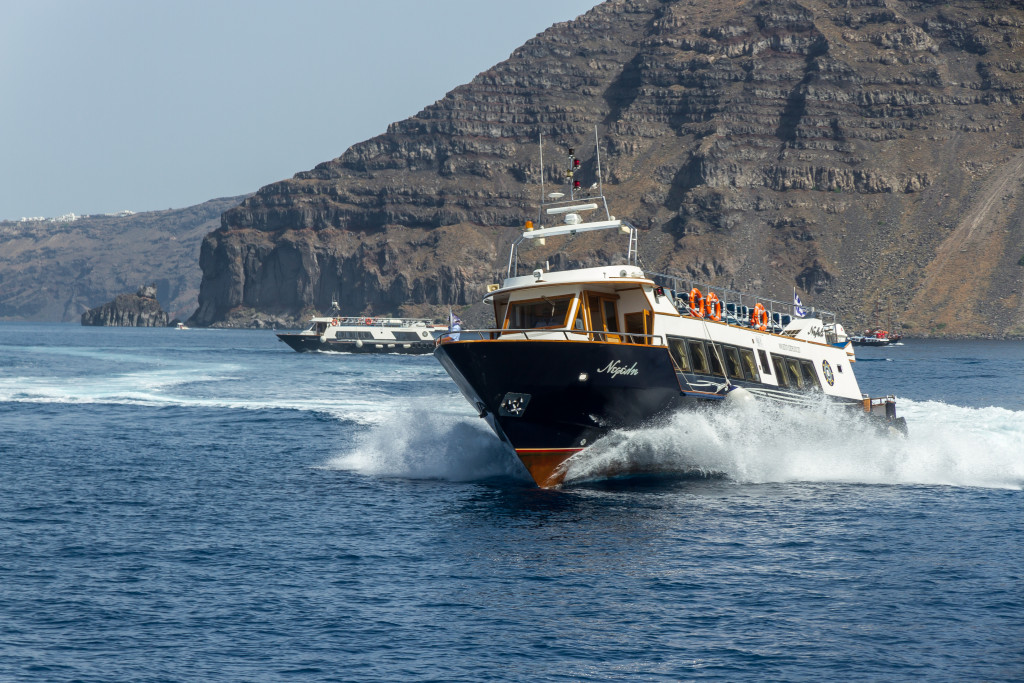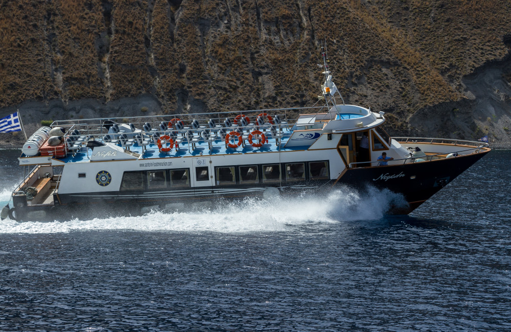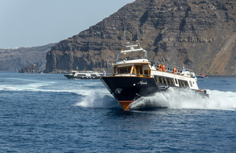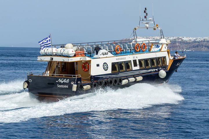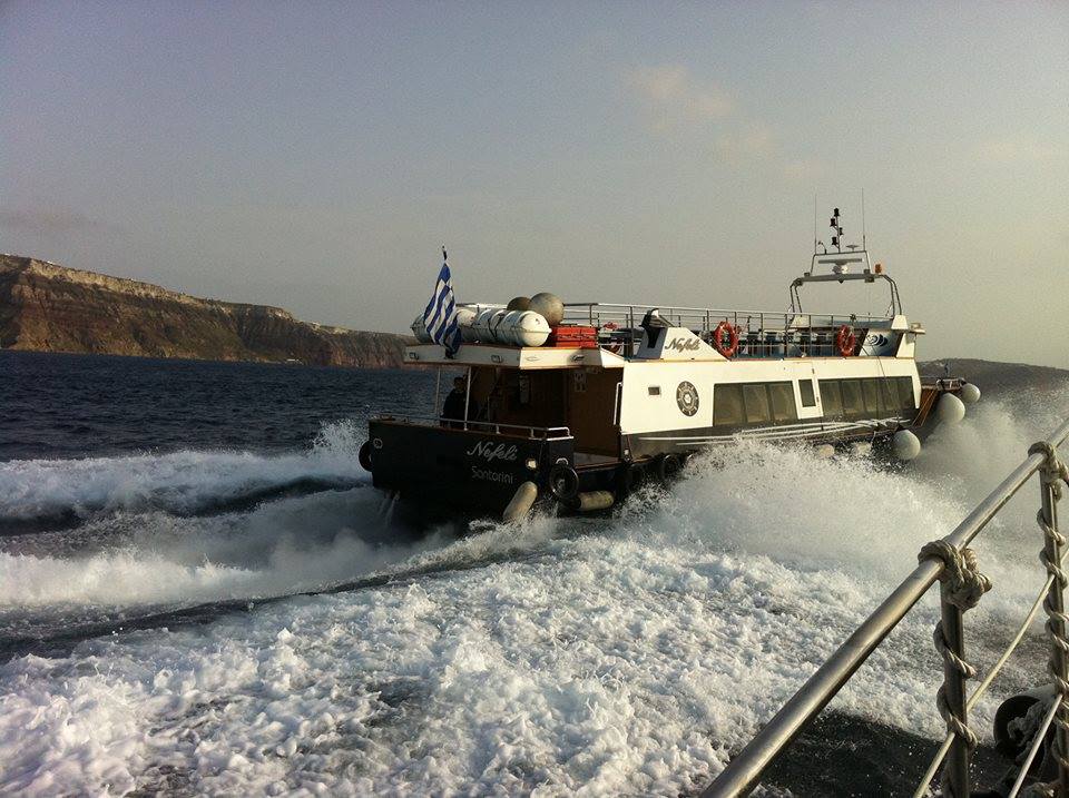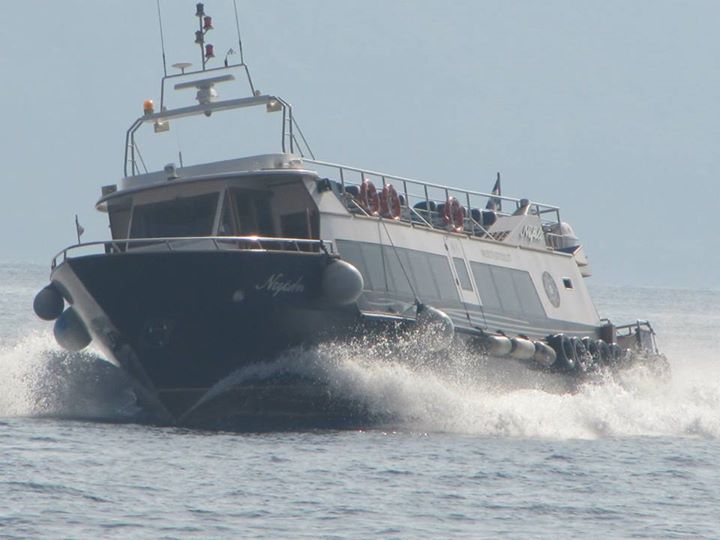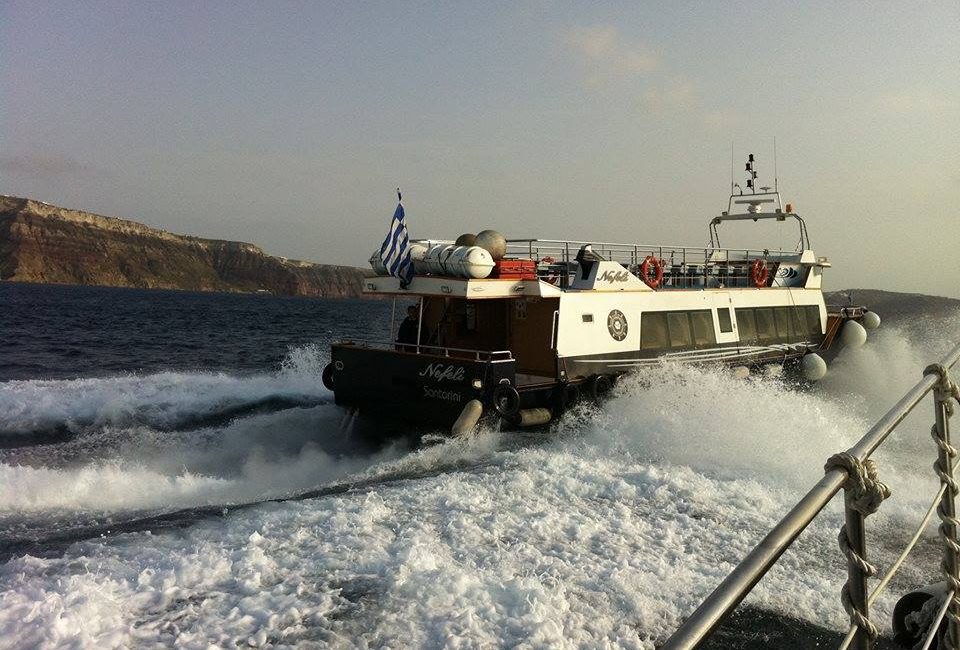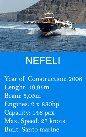 The name come the Greek word nephos that means “cloud”, in the Greek mythology, Nephele was a cloud nymph who figured prominently in the story of Phrixus and Helle. Greek myth also has it that Nephele is the cloud whom Zeus created in the image of Hera to trick Ixion to test his integrity after displaying his lust for Hera during a feast as a guest of Zeus. The vessel has been built in 2008 by the Epsilon Marine, who had the shipyard in Chalcidice, it has been provided of all the most synchronous technologies and of two engines that supplies 800hp each one. Its lounge has been completely restored in our own shipyard in Vlychada, Santorini, on 2010, providing the vessel of a comfortable air-conditioned lounge with leather and wooden sofas extremely refined and cozy. It was the fastest vessel of the fleet with a maximum speed of 29 knots per hour.