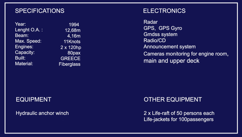 The vessel has been dedicated to the leader businessman who has roots from Santorini and has contributed to the Factory Development in Santorini, mainly through the production of tomato paste, Georgios Nomikos. it has been one of the first boat that the union bought, it was the 1994, but from that year until now we invested a lot of money to upgrade the quality of the vessel making as well the lounge much more comfortable.
