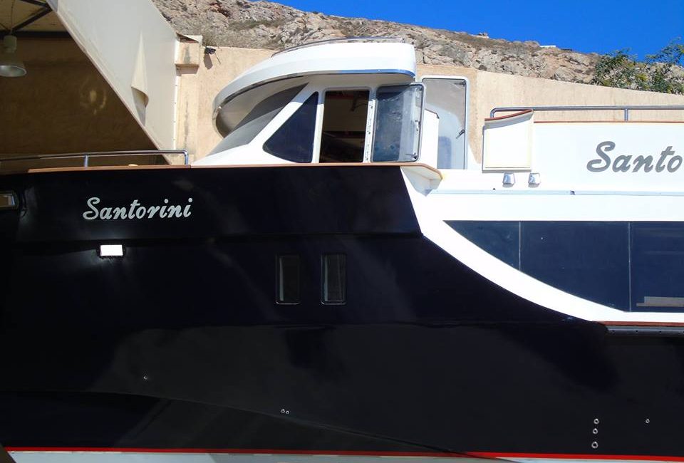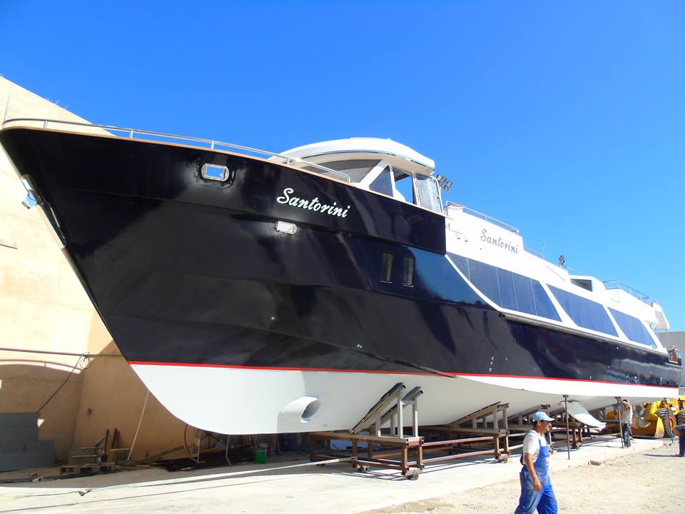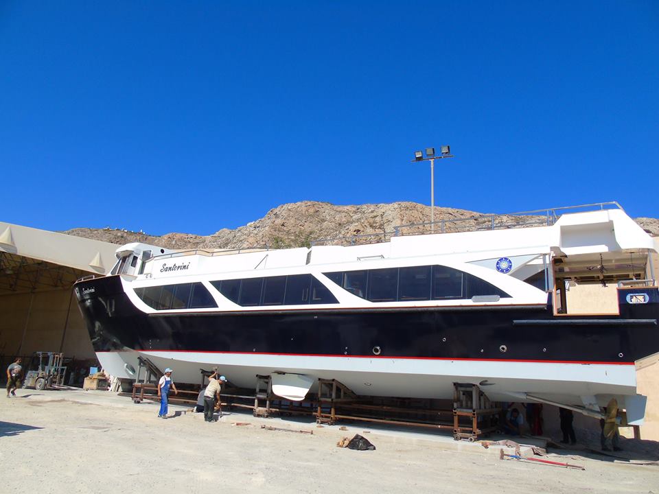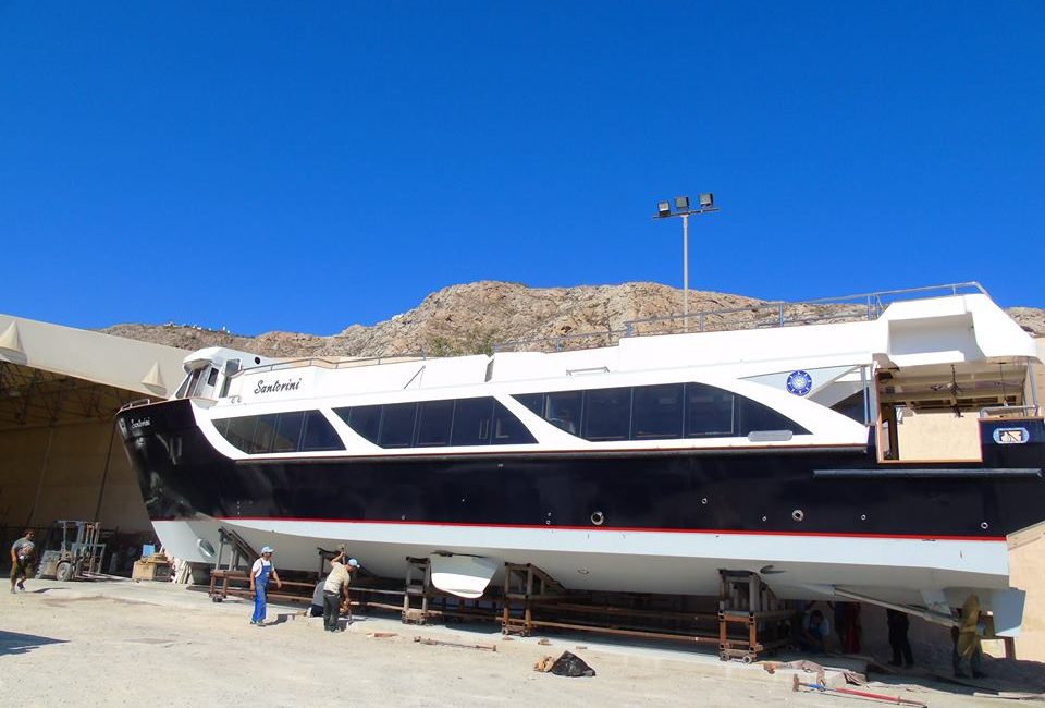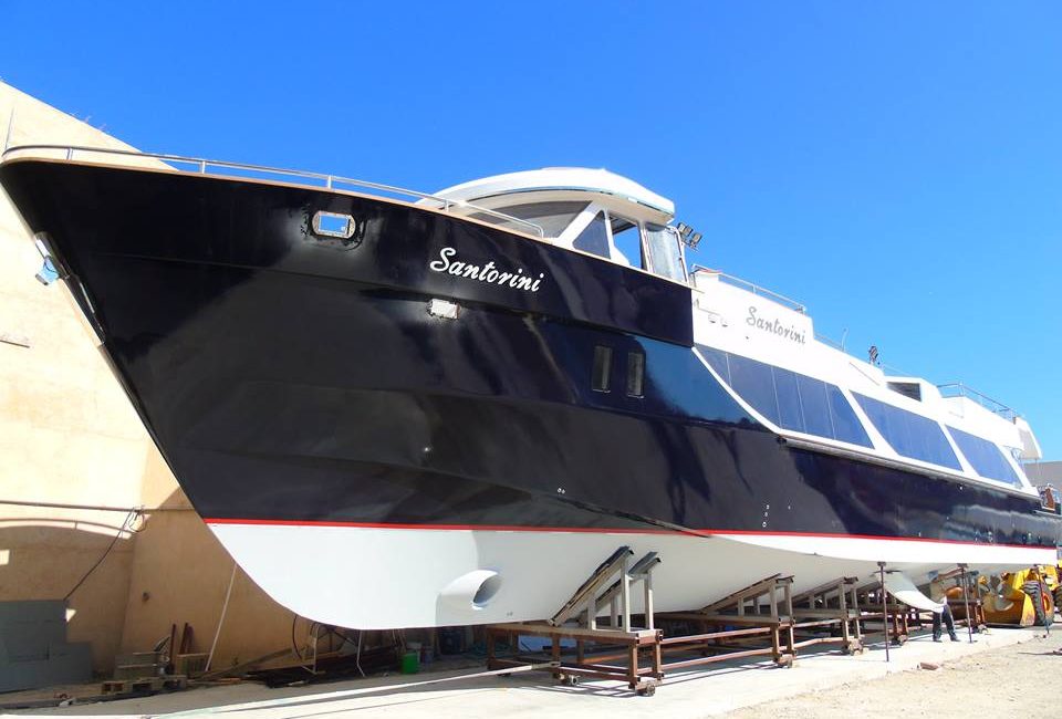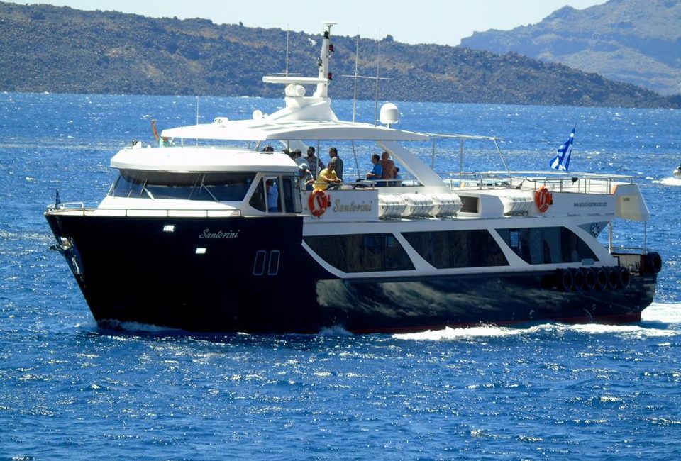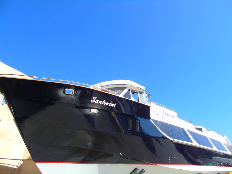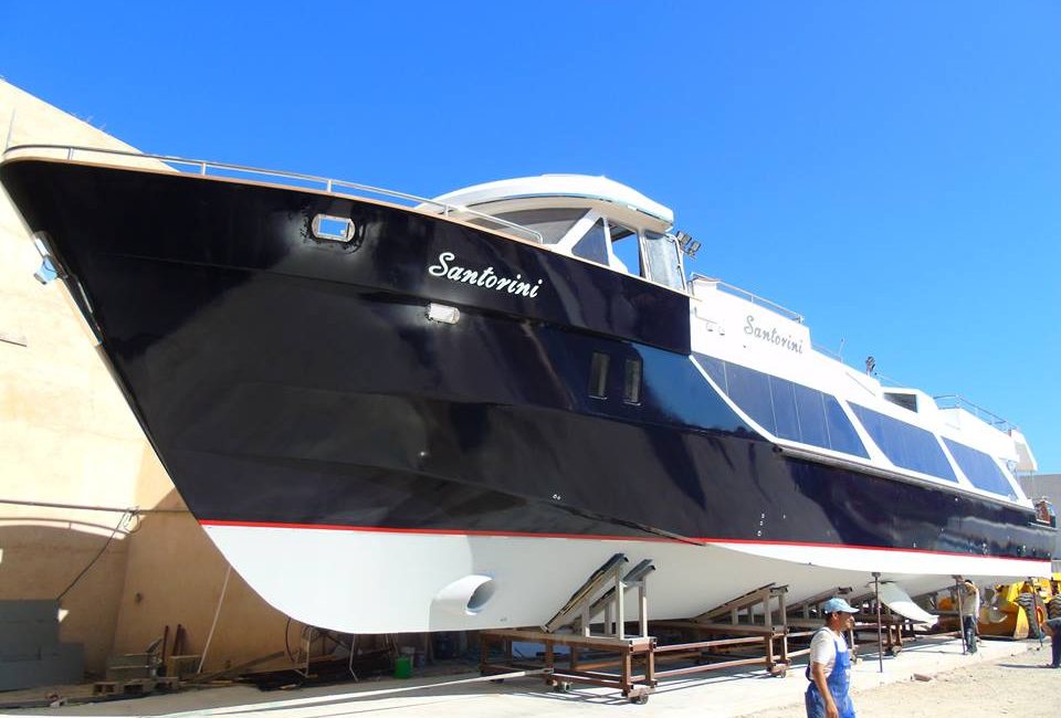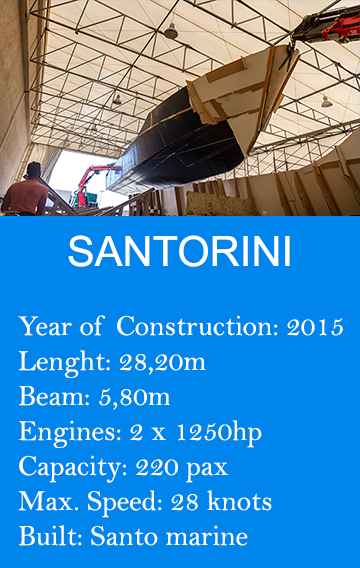 Santorini is the second luxury passenger vessel completely made in Santorini in our own shipyard SantoMarine. The boat will be launched on June 2015 and it will be dedicated to our island Santorini. This vessel will be the flagship of our large fleet made of 18 passenger vessels, the most developed motorboat, that will set a new level standard about comfort, cruise speeds, safety and quality of the service. It accommodates 200 passengers divided between the two decks and an air-conditioned indoor lounge fully equipped with bar, toilets and well refined marine sofas. . The vessel is designed to have excellent sea-keeping characteristics in the Aegean Sea conditions due to the form of the hull and  its special stabilizer system. It will be used especially for the vessel chartering and the organized daily tours to the islands around Santorini.