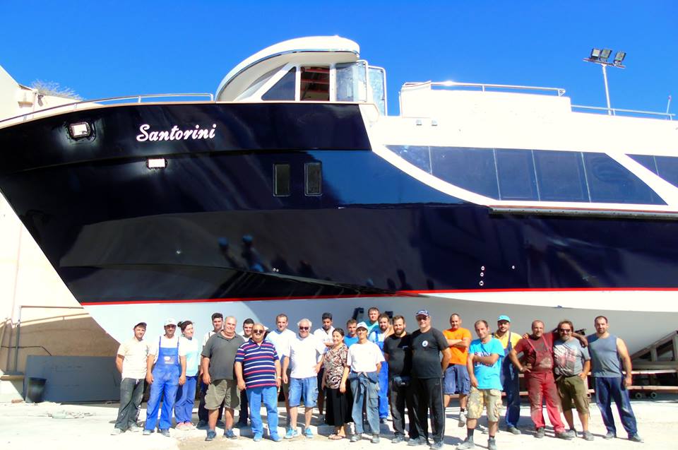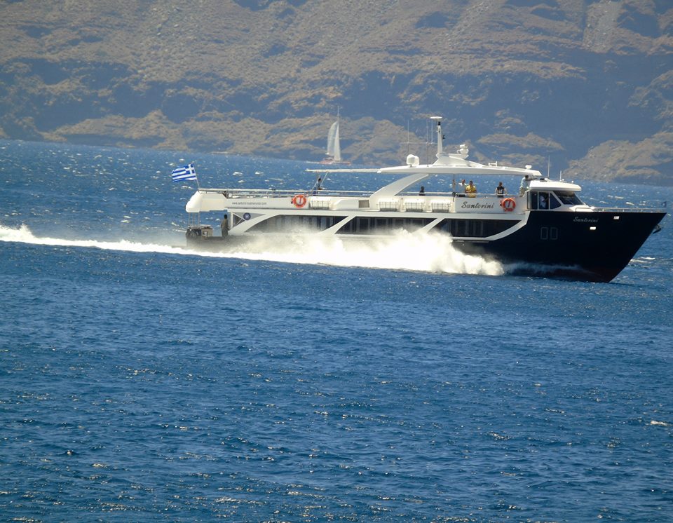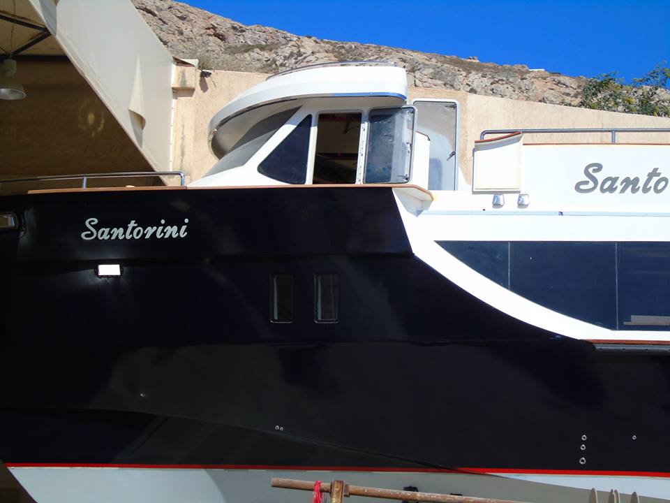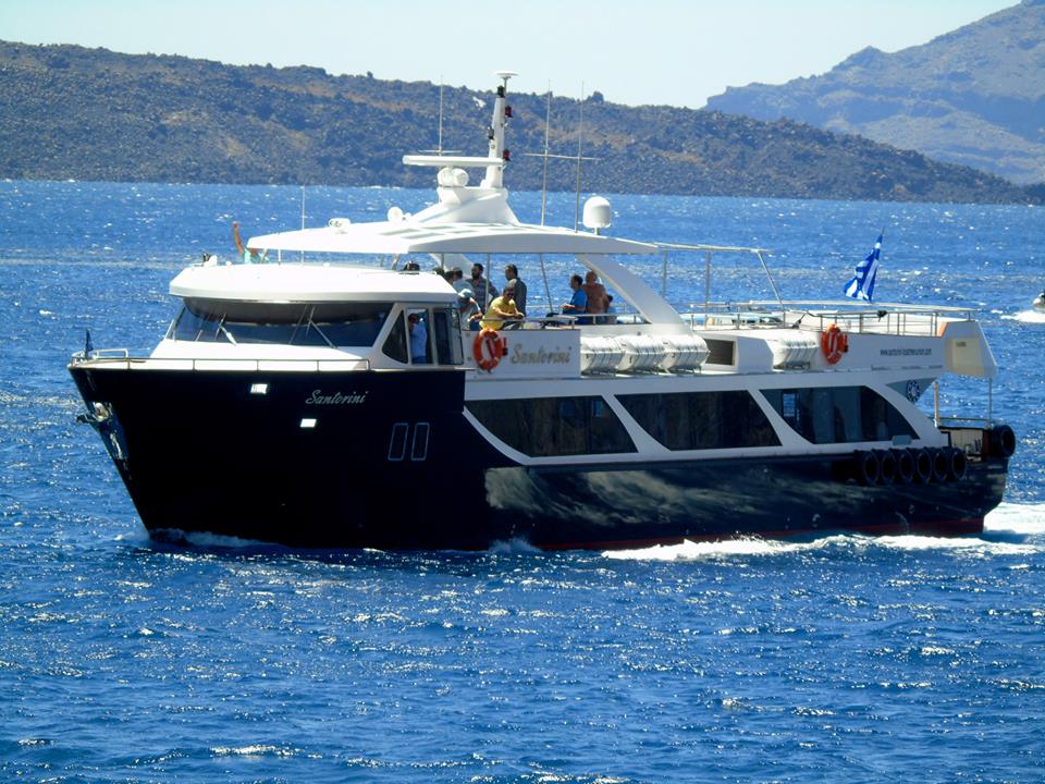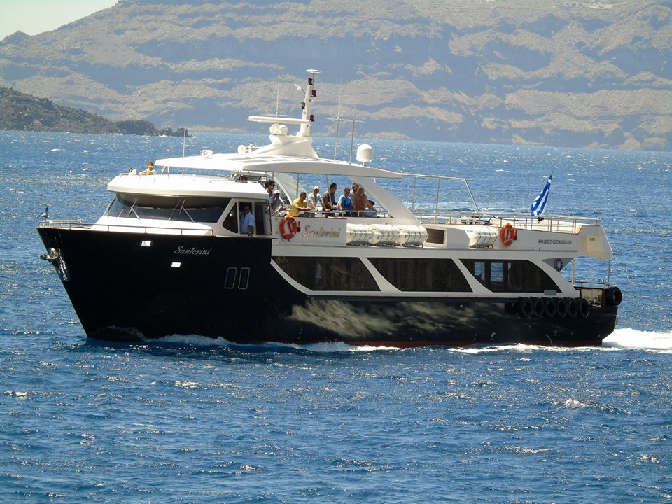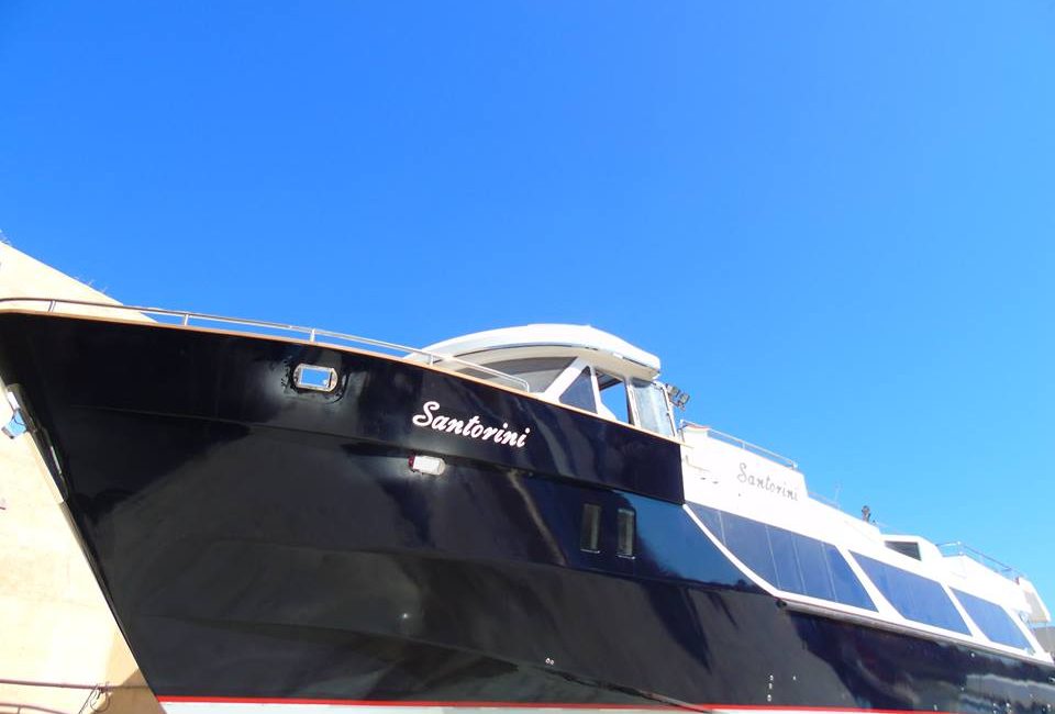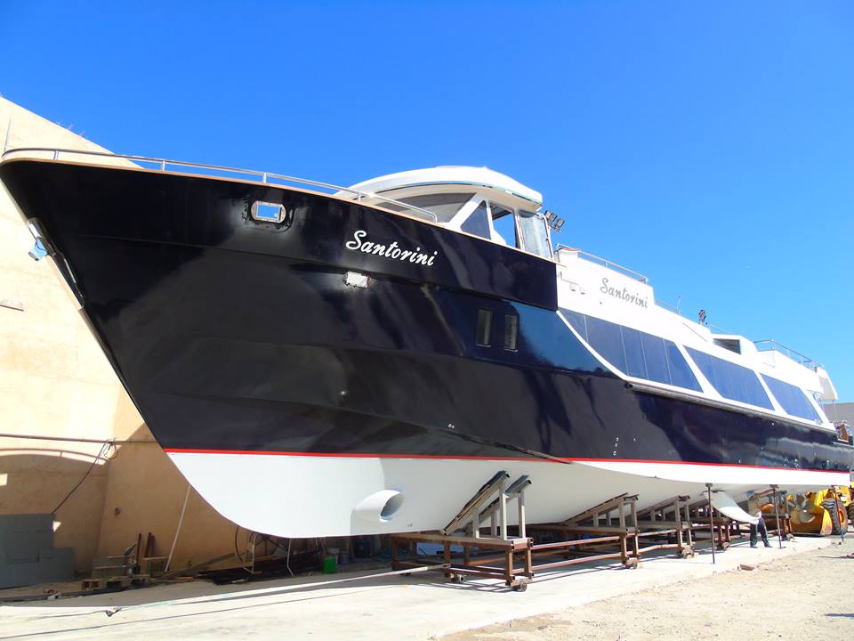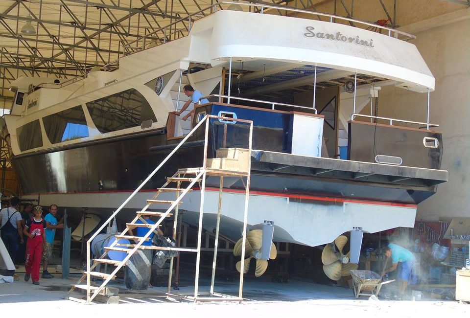 Santorini is the second luxury passenger vessel completely made in Santorini in our own shipyard SantoMarine. The boat will be launched on June 2015 and it will be dedicated to our island Santorini. This vessel will be the flagship of our large fleet made of 18 passenger vessels, the most developed motorboat, that will set a new level standard about comfort, cruise speeds, safety and quality of the service. It accommodates 200 passengers divided between the two decks and an air-conditioned indoor lounge fully equipped with bar, toilets and well refined marine sofas. . The vessel is designed to have excellent sea-keeping characteristics in the Aegean Sea conditions due to the form of the hull and  its special stabilizer system. It will be used especially for the vessel chartering and the organized daily tours to the islands around Santorini.