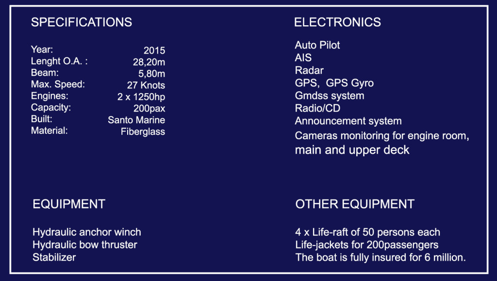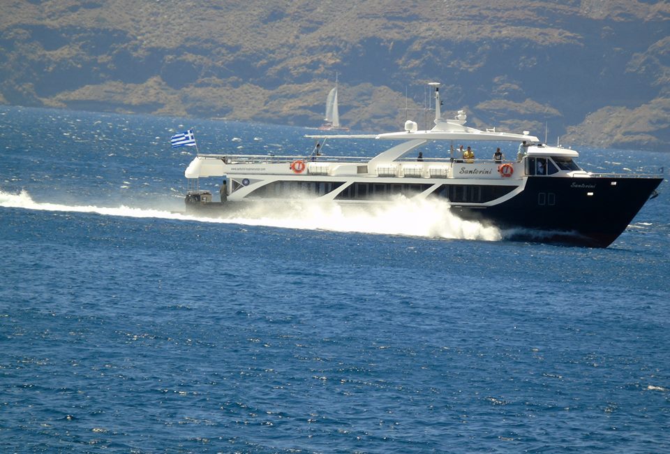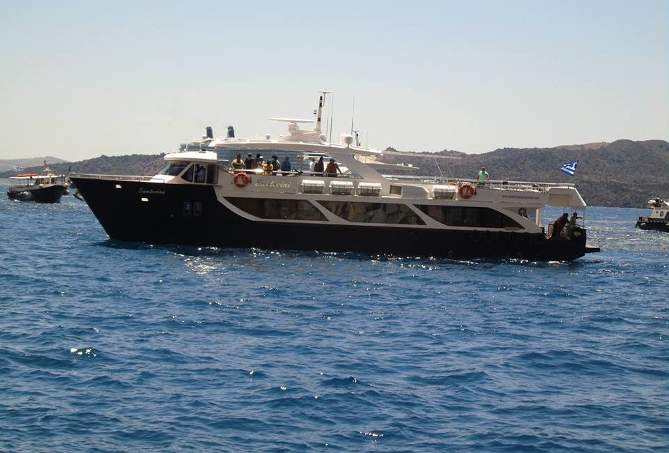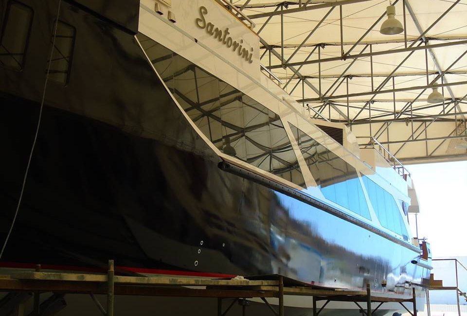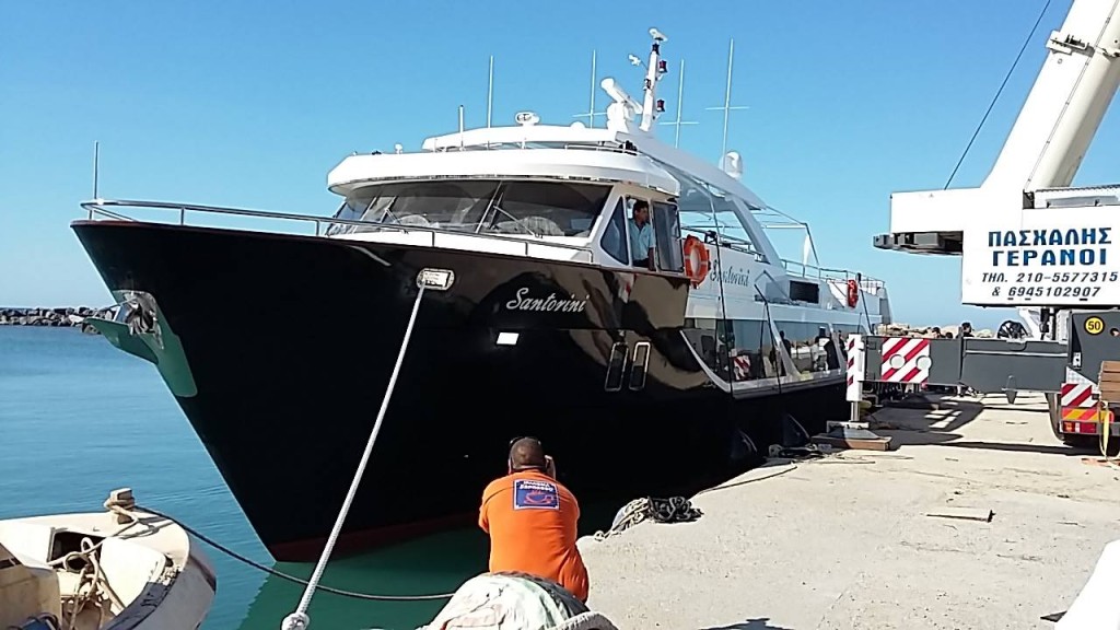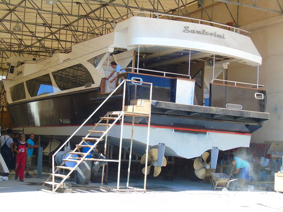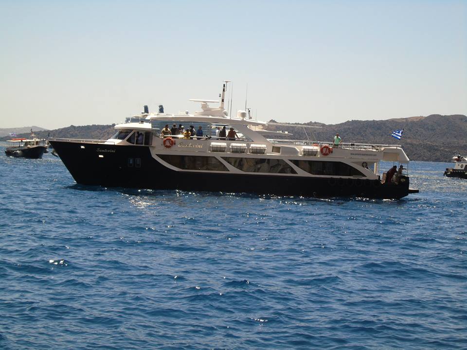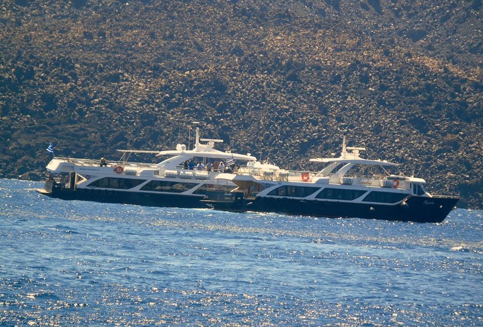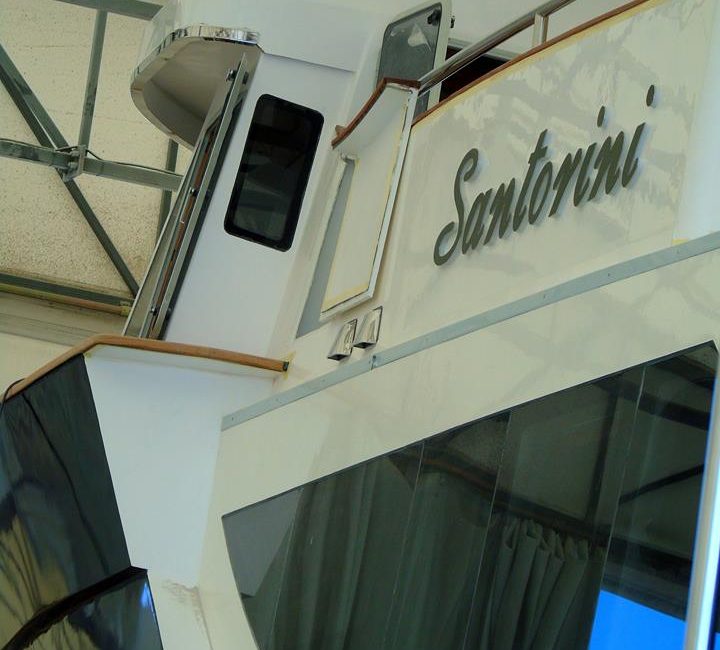 Santorini is the second luxury passenger vessel completely made in Santorini in our own shipyard SantoMarine. The boat will be launched on June 2015 and it will be dedicated to our island Santorini. This vessel will be the flagship of our large fleet made of 18 passenger vessels, the most developed motorboat, that will set a new level standard about comfort, cruise speeds, safety and quality of the service. It accommodates 200 passengers divided between the two decks and an air-conditioned indoor lounge fully equipped with bar, toilets and well refined marine sofas. . The vessel is designed to have excellent sea-keeping characteristics in the Aegean Sea conditions due to the form of the hull and  its special stabilizer system. It will be used especially for the vessel chartering and the organized daily tours to the islands around Santorini.