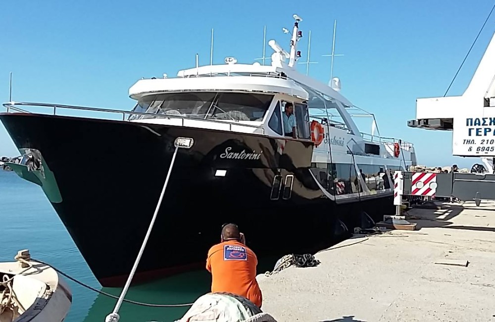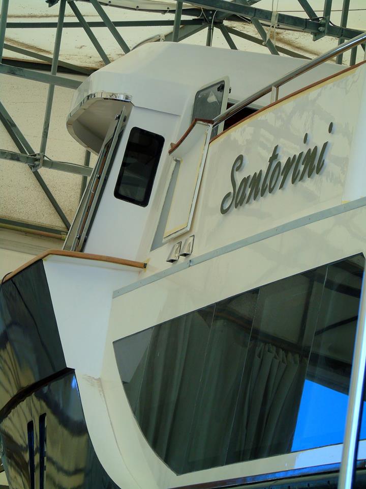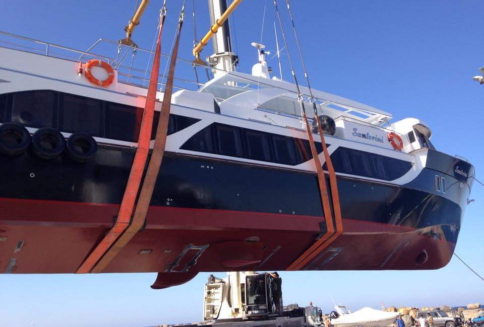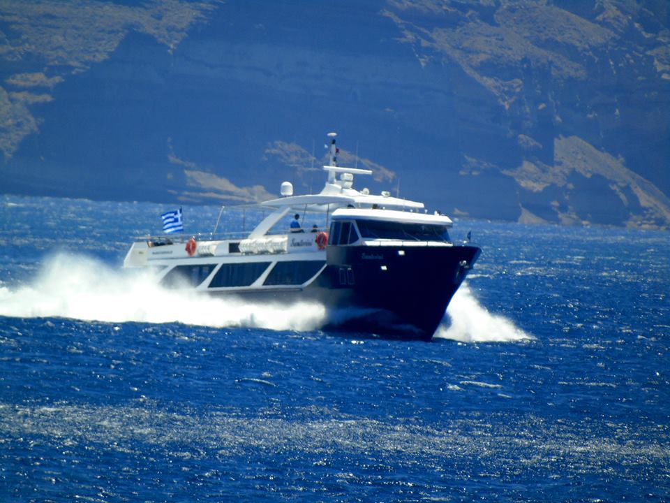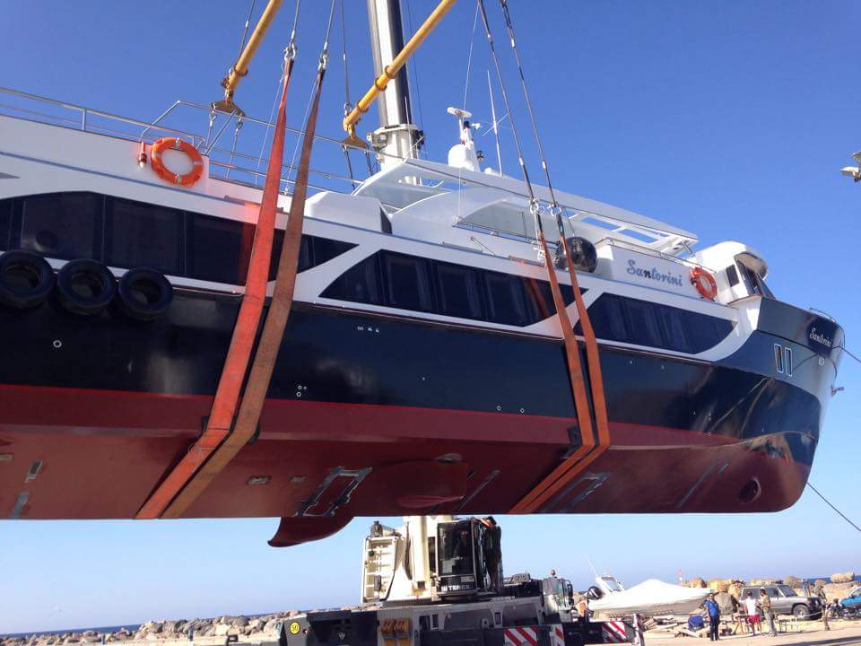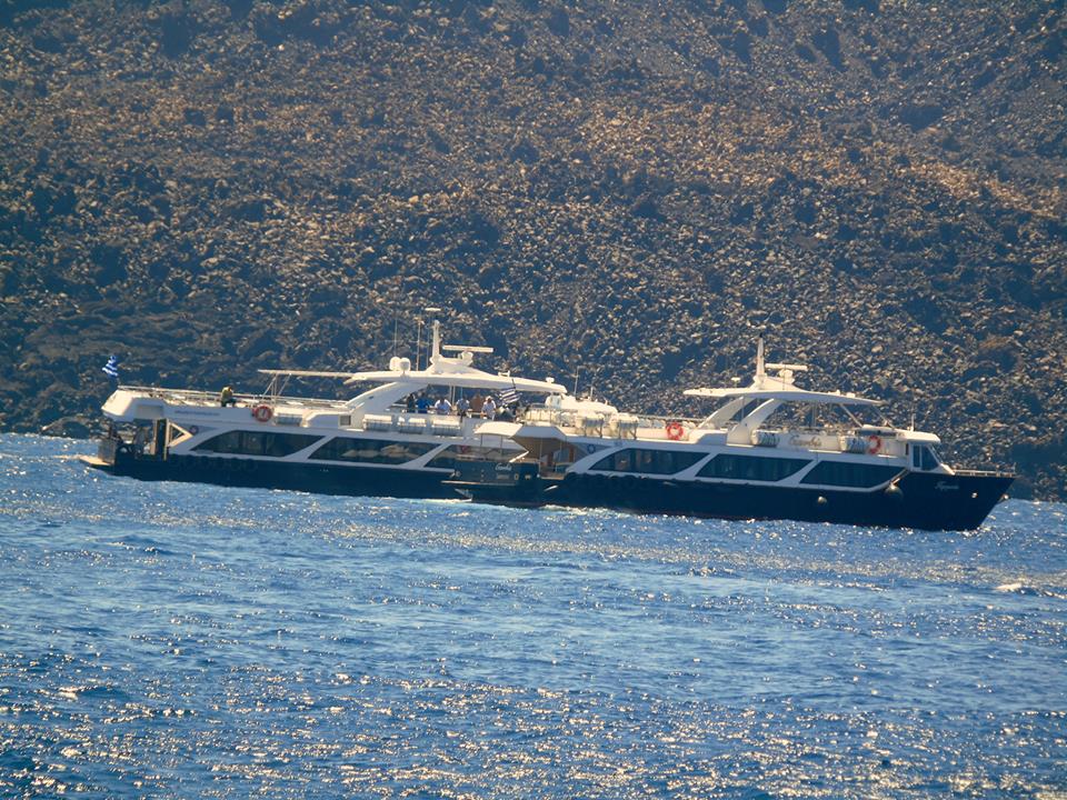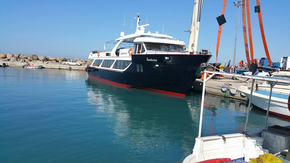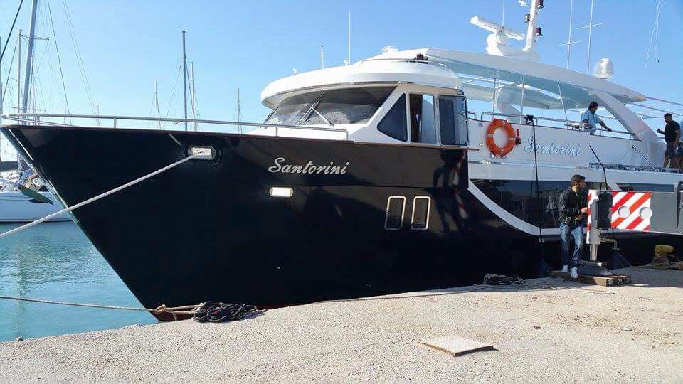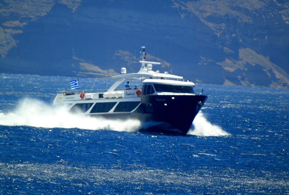 Santorini is the second luxury passenger vessel completely made in Santorini in our own shipyard SantoMarine. The boat will be launched on June 2015 and it will be dedicated to our island Santorini. This vessel will be the flagship of our large fleet made of 18 passenger vessels, the most developed motorboat, that will set a new level standard about comfort, cruise speeds, safety and quality of the service. It accommodates 200 passengers divided between the two decks and an air-conditioned indoor lounge fully equipped with bar, toilets and well refined marine sofas. . The vessel is designed to have excellent sea-keeping characteristics in the Aegean Sea conditions due to the form of the hull and  its special stabilizer system. It will be used especially for the vessel chartering and the organized daily tours to the islands around Santorini.