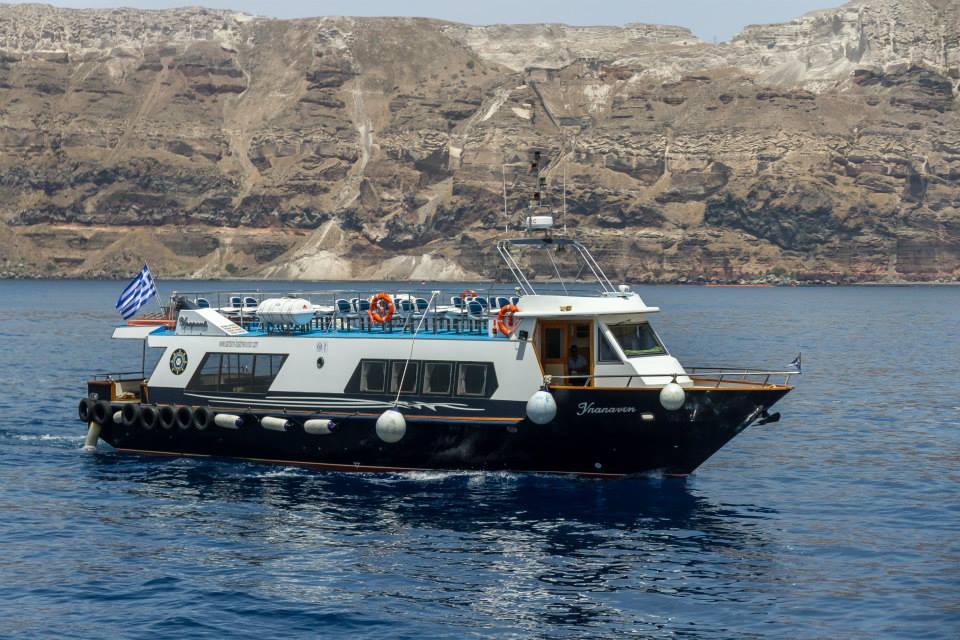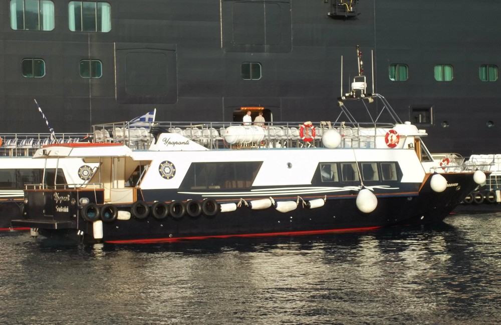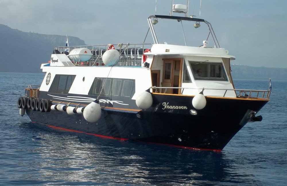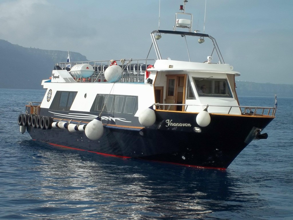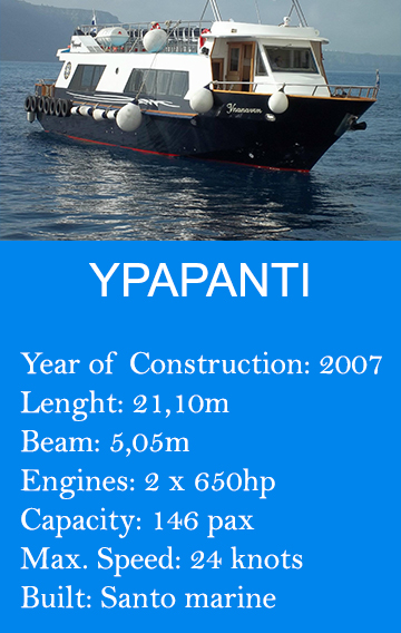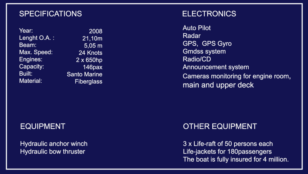 The name come from Ypapanti, a parish of the Greek Orthodox Metropolis of Pittsburgh and the Greek Orthodox Archdiocese of America under the Spiritual Jurisdiction of the Ecumenical Patriarchate of Constantinople. The boat at the beginning has been built in 2008 by the Epsilon Marine for a diving center of Crete, for this reason when the union decided to buy it, it has been extremely modified in our own shipyard, transforming the upper deck, the lounge air-conditioned saloon and as well the back deck of the boat. We added leather and wooden well refined sofas, comfortable passenger’s seats at the upper deck and also a back bridge to be used in case of excursion where easily we put aluminum stairs to get in/out of the water. It has also been provided of all the instruments as radar, gps, auto pilot and ISPS as the other vessels we own.